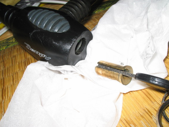 っていうかこれで D☆opy 製のシリンダー錠なワイヤー錠を 破壊する方法が判明してしまったね。 鍵穴に何かをつっこんで、 引っかけるようにして引っ張り出してしまえば、 あとは奥にある変な部品を回してやるだけで鍵が開く。 特に老朽化した (といってもこれは 1 年 3 か月しか たっていないのだが) やつなら簡単だろう。 ある意味欠陥商品だね!