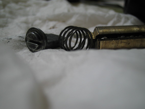 崩壊した錠の穴の内部の様子。片方にはシリンダー錠を構成する穴、 奥にバネが見える。バネを取り出してみた。すぽっと抜けてしまった錠の部分にはバネの残骸みたいなものが。