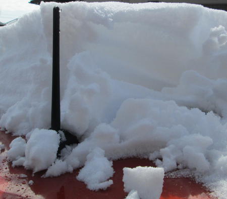 車のラジオ用アンテナと雪の高さを比べれば、やはり今回のほうがたくさん積もったように見える。 ただし前回の日曜日朝の状況は確認していなくて不明なので、もっと積もっていた可能性はあるけど。
