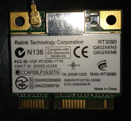 特に焦げた跡などはなく、きれいなまま静かに寿命を迎えたようだ。 あるいは、本体側の問題の可能性もないわけではないが。 取り外して初めて知ったのだが、無線 LAN カードそのものに技適マークが付いていた。 すなわち、何年か使用していたのは電波法に触れる行為ではなかったはずだということを今更ながら確認できた。 特に技適マークを確認することなく使用していた理由は、OLIOSPEC で買ったので、問題ないはずと信じていたためである。