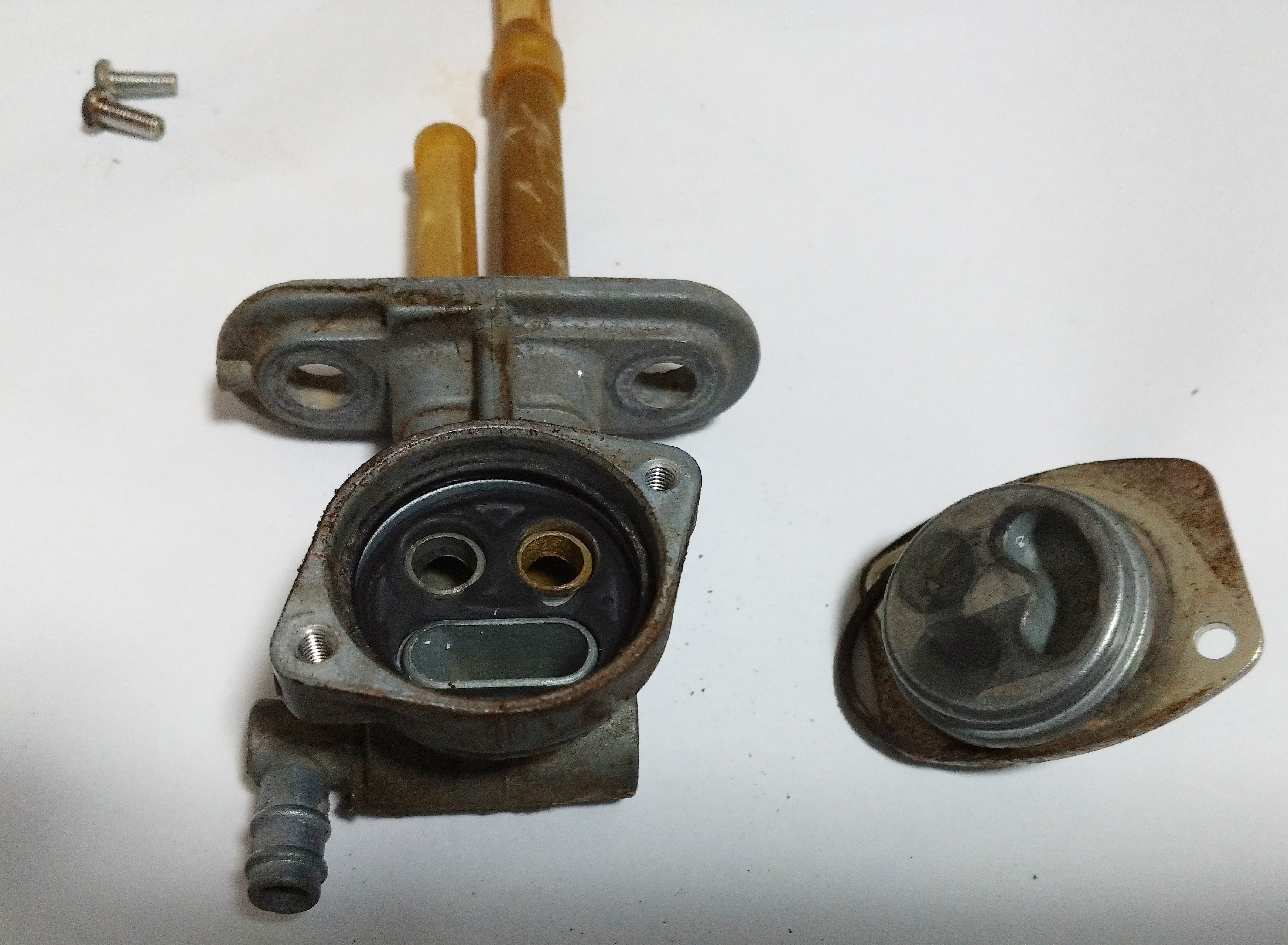この色の違いは気になるところで、もしかして ON 側は詰まっていたのかなぁ。 何しろ OFF にしても普通に走れるぐらいにはだだ漏れだったし、ON にしても完全にガス欠するまで走れてしまったわけで、フューエルワンを入れた関係で RES 側と出口側はピカピカになって、ON 側は全然流れていなかったから汚れは落ちなかった、ということか? 詰まった理由が気になるが、ひょっとしたら、長期保存前に燃料を抜くときに、RES にして抜いたために ON の側には燃料が残ったまま長期保存に入ってしまった、みたいなことかも知れない。 とにかく、この部品は新品交換してよかったなと。 残りの負圧コックやらストレーナーやらも交換したほうがいいかもな。